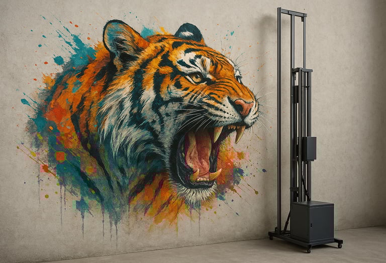 Unique technology, limitless surfaces. Our vertical wall printer allows us to print high-quality, full-colour designs directly onto almost any surface — brick, glass, plaster, concrete, metal, and more. No stickers, no frames — just seamless, durable results that feel like part of your space.
